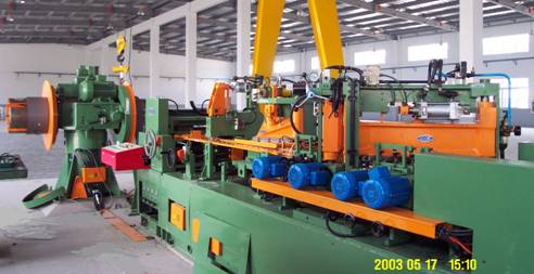 此生產線(如圖一)主要功能為將分條定寬度後之矽鋼片捲, 解捲經沖孔、V Notch及剪切成變壓器用之矽鋼片, 由於變壓器之容量大小及用途不同, 其形狀之變化相當多,
